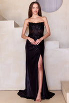 Brilla con este vestido largo de satén sin tirantes con apliques bordados y falda entallada con abertura de Amelia Couture 9055.