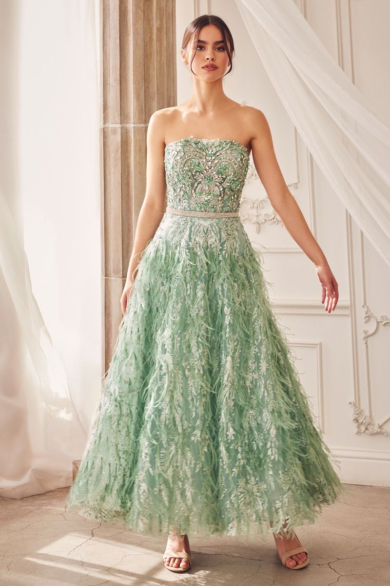 Te encantará girar con este vestido palabra de honor largo hasta el tobillo, adornado con cuentas y falda de plumas en línea A de Andrea & Leo A1226. Adéntrate en un mundo de encanto con este vestido palabra de honor largo hasta el tobillo, una obra maestra caprichosa que gira con la magia de los sueños. El corpiño de cuello recto con pedrería brilla como un cielo estrellado, añadiendo un toque de encanto celestial. La falda evasé, adornada con plumas brillantes, es una danza de fantasía y elegancia, cada paso una celebración revoloteante. Para rematar este cuento de hadas, un cinturón de pedrería plateada añade un toque regio, definiendo tu cintura con un toque de brillo.