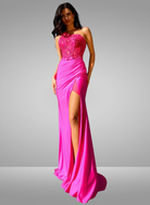 Disfruta de un momento mágico con este vestido largo de un hombro de satén con aplicaciones de cuentas bordadas y falda con aberturas de Nox Anabel A1317.