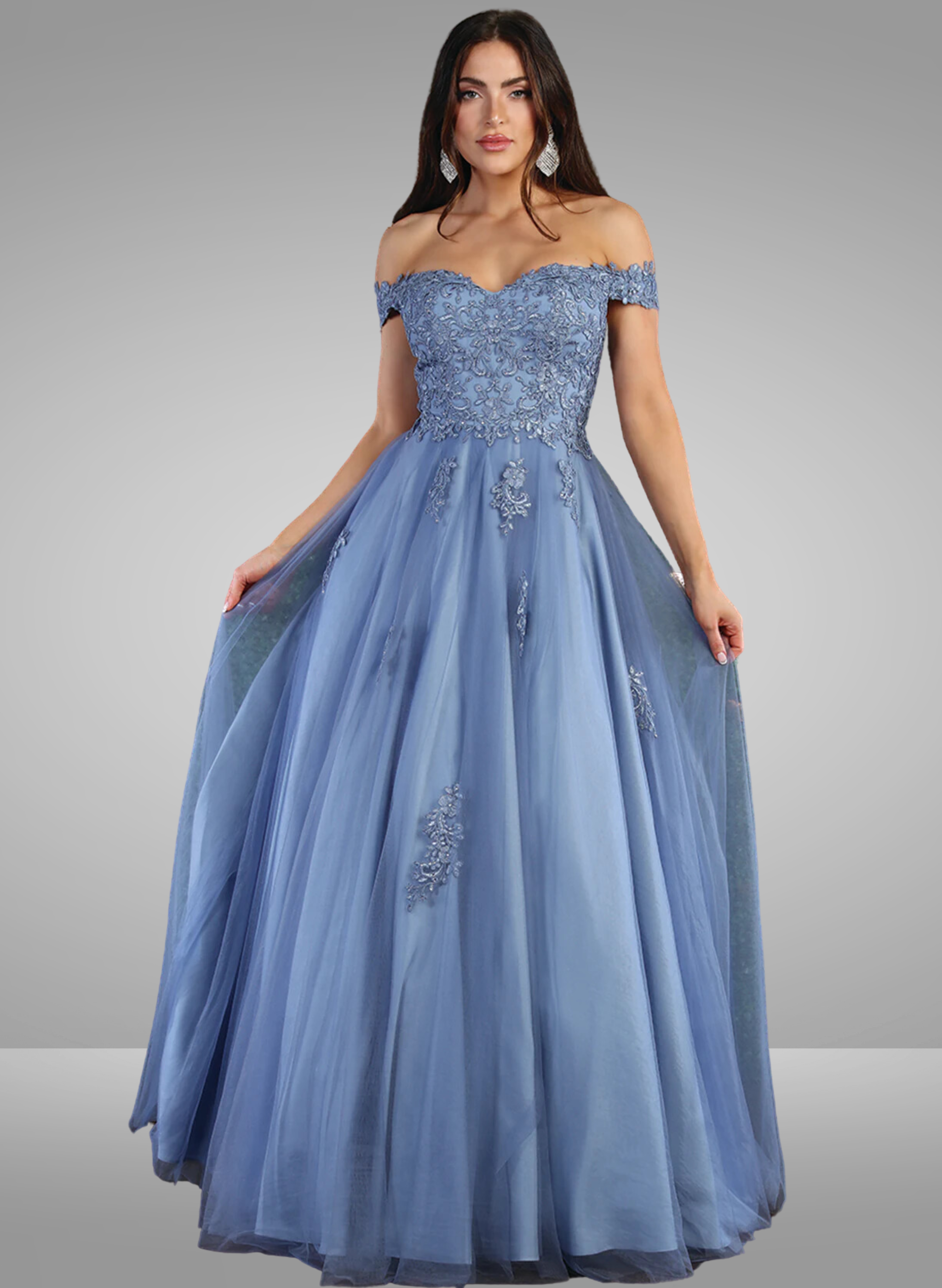 Vestido de fiesta con adornos florales y hombros descubiertos