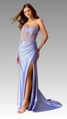 Sé el centro de atención con este vestido largo sin tirantes de satén, con apliques de lentejuelas y falda ajustada con abertura de Amelia Couture 956.