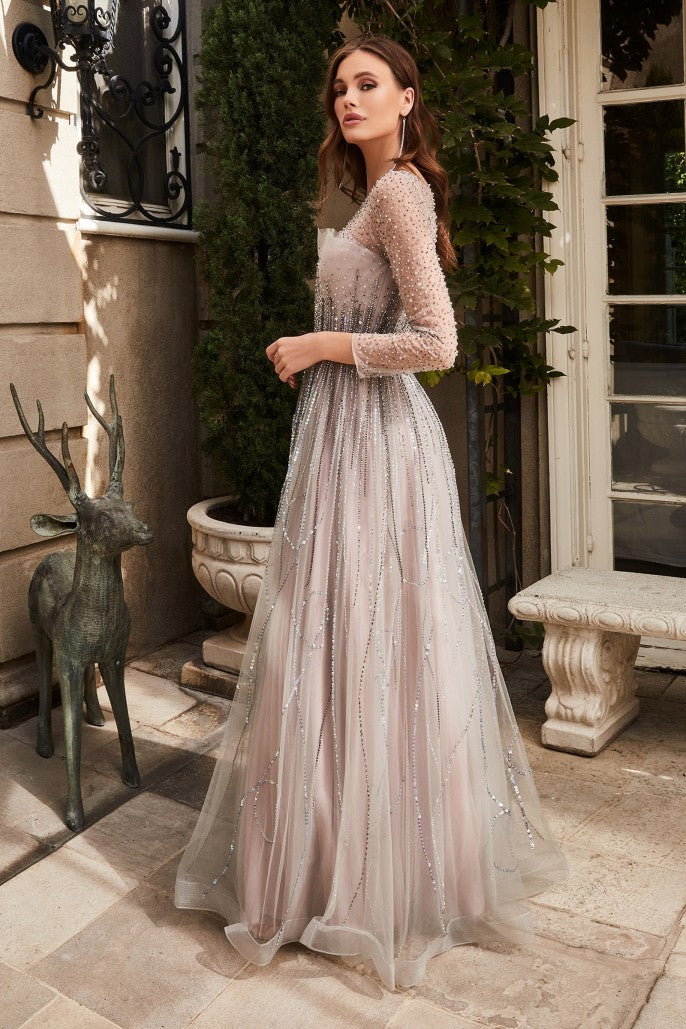 Pídale en un cuento de hadas en esta belleza de vestir. Este vestido tiene una manga larga transparente con adornos y escote alto. Un escote superpuesto en capas se cubre con cuentas que gotea por la falda de la línea A. La cremallera central es transparente en la mitad de la espalda con un detalle con cuentas de espalda completamente cubierta.