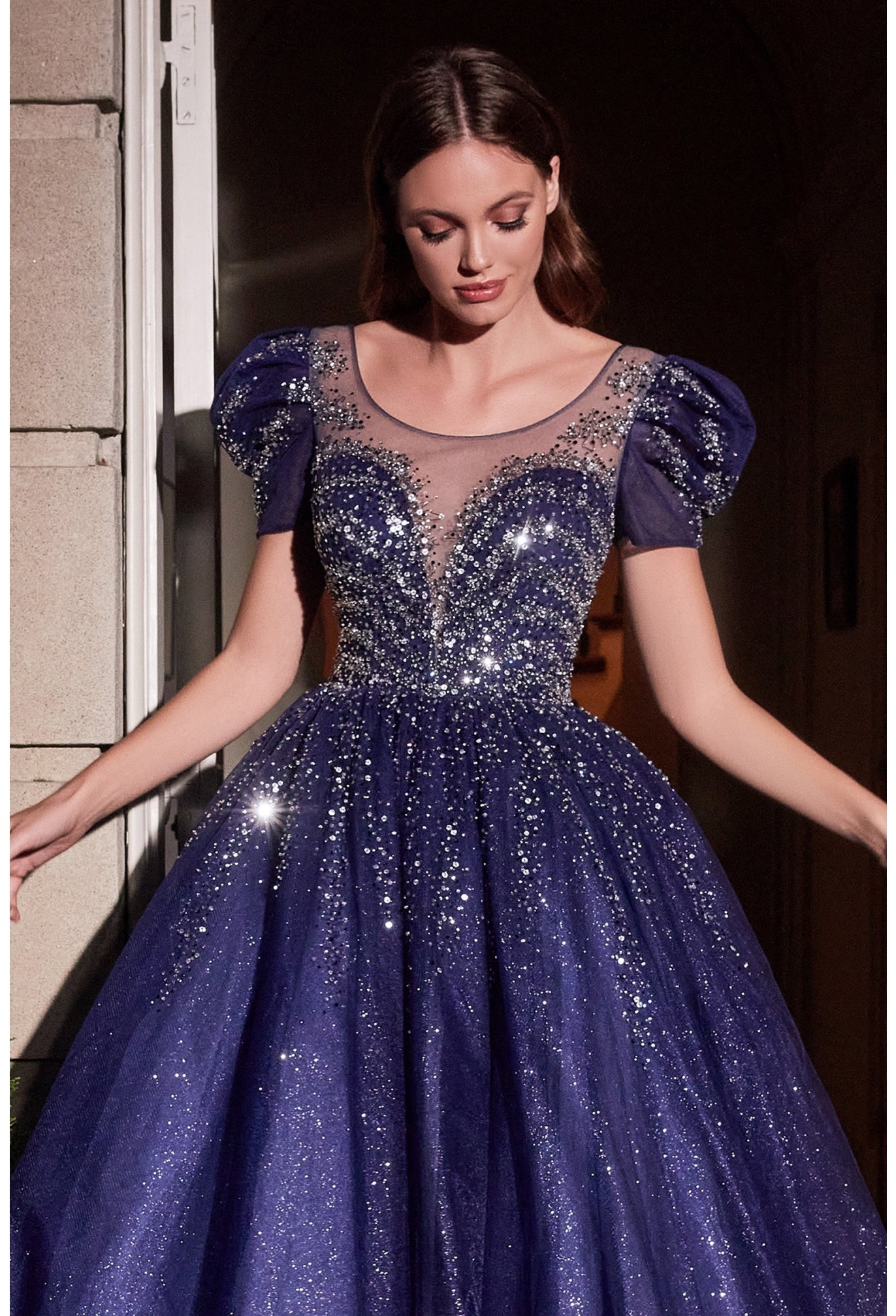 Las estrellas se han alineado con este vestido de pelota de cuento de hadas centelleante. Este vestido brillante se corta con capas de tul de medianoche. El corpiño presenta un escote de amor de ilusión profunda encantado con adornos brillantes y mangas de hojaldre.