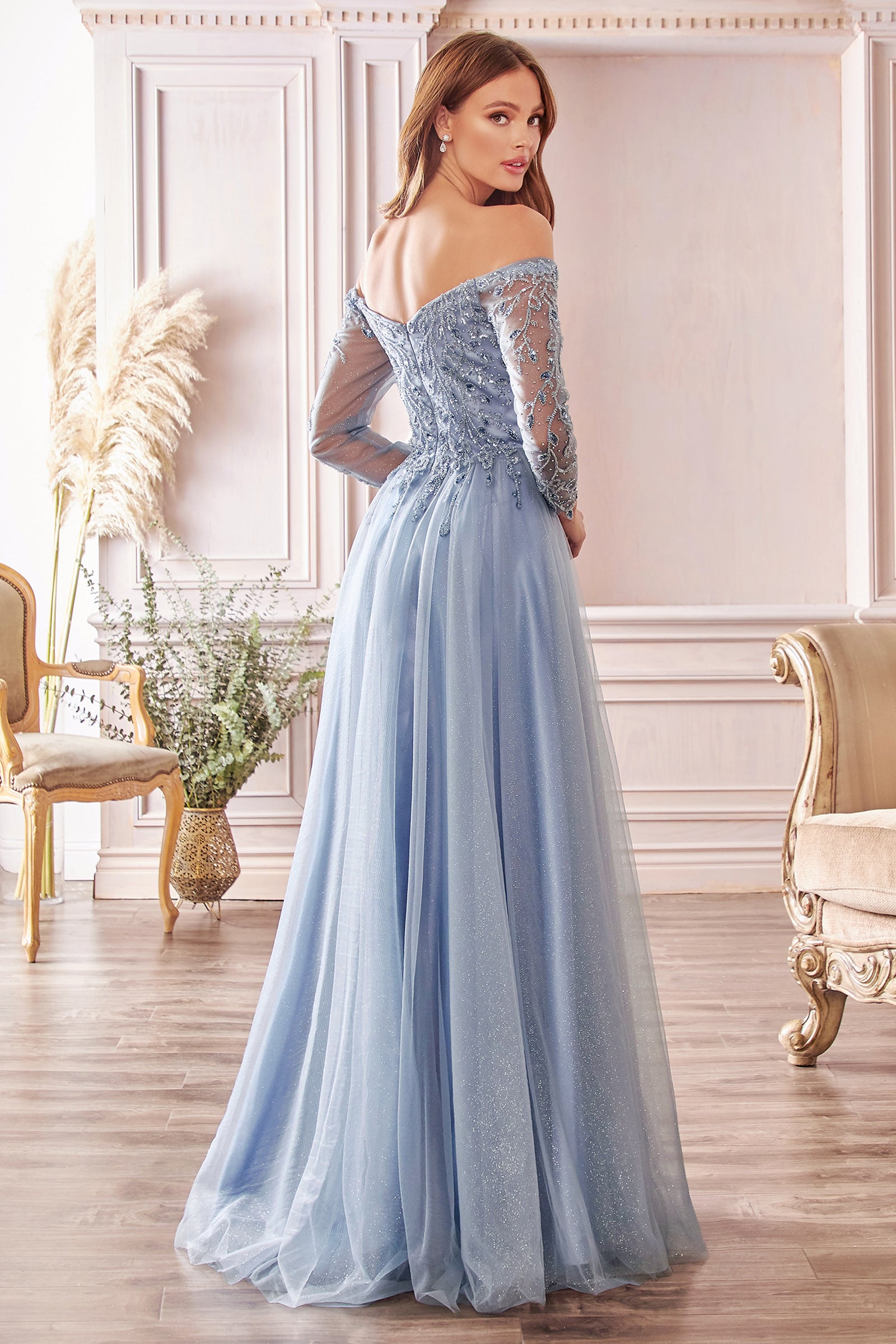 Haga una impresión duradera en este exquisito vestido de línea A. Con sus mangas largas hombro descubierto y sus elegantes escote corazón adornado de encaje, estarás girando la cabeza, mientras te verás sofisticado. La silueta del vestido es completamente halagadora, enfatizando su figura sin ser demasiado abrazada. Y la falda de tul en capas agrega un aire innegable de elegancia. Ya sea que se trate de una boda o una ocasión especial, asegúrese de elegir un aspecto inolvidable con este lujoso vestido.
