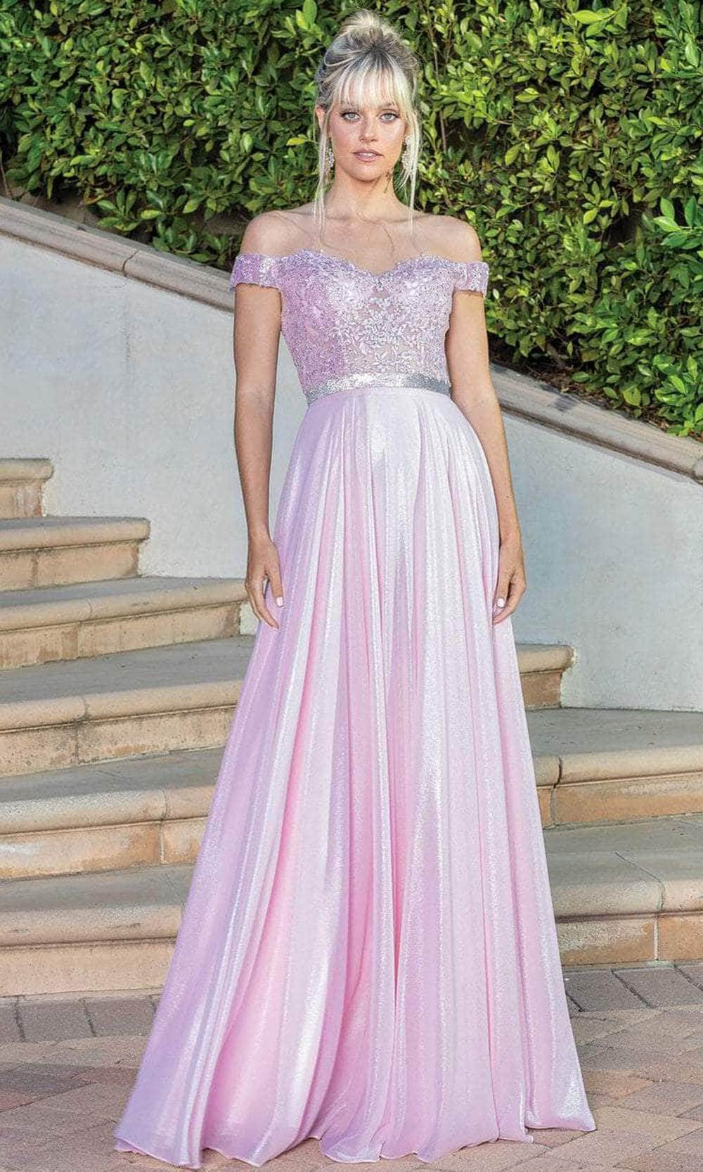 Este encantador Dancing Queen 4222 seguro que te convertirá en el centro de atención de todos. El corpiño semi transparente tiene un glamoroso escote fuera del hombro con mangas drapeadas, envuelto maravillosamente en encaje de cuentas con un cinturón brillante añadido para un aspecto elegante. La falda de estilo plisado fluye con gracia en una silueta de línea A que termina magníficamente con una cola de barrido. Muestra tu lado más suave con este encantador vestido de noche de Dancing Queen. Las modelos llevan los colores Bahama Blue, Black, Blush, Lilac, Rose Gold.