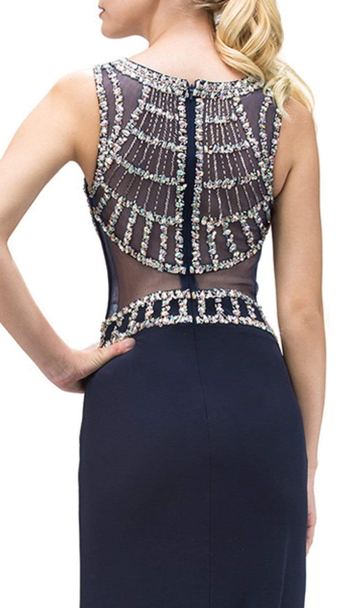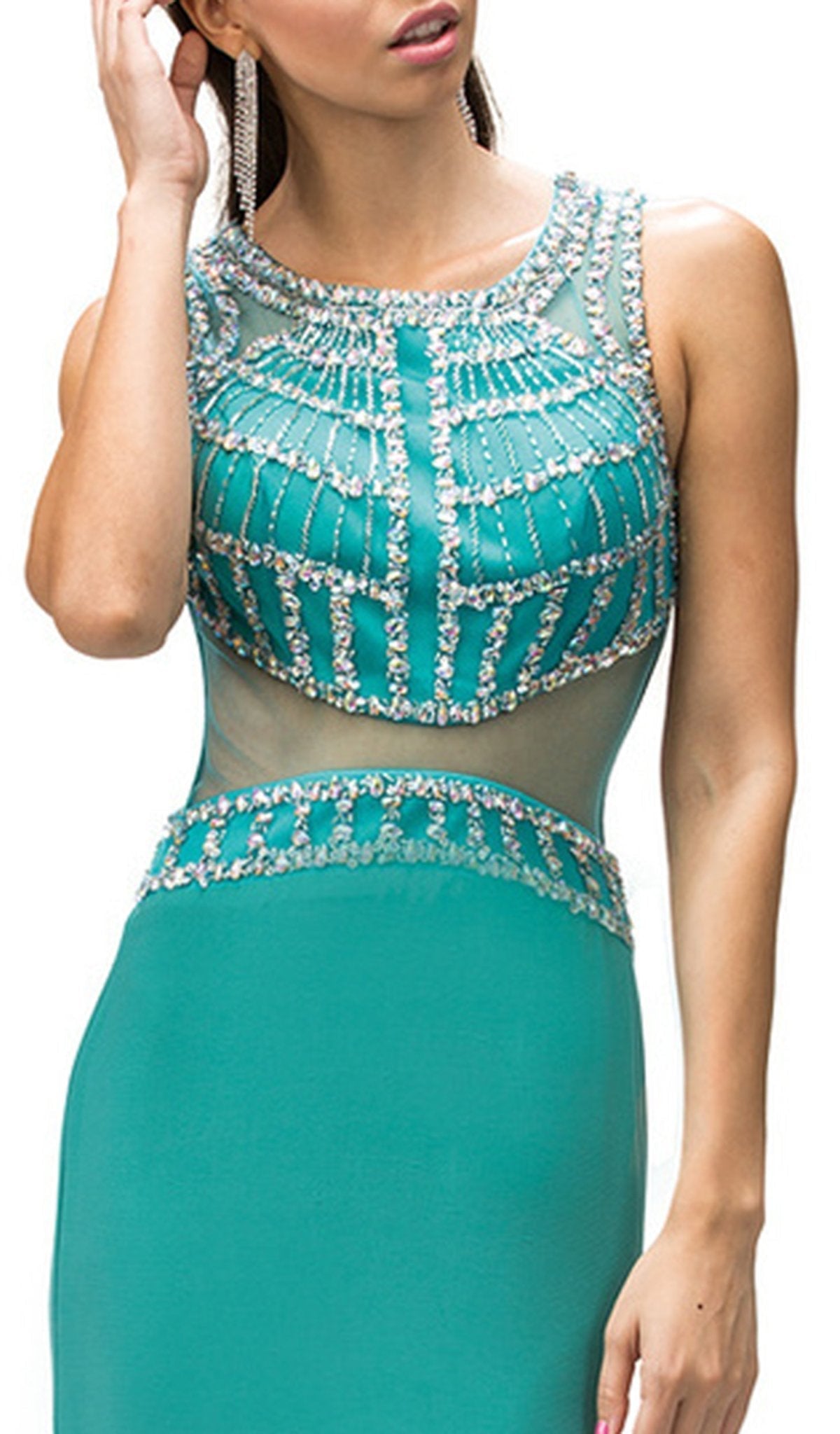 Este impresionante vestido de fiesta joya hasta el suelo está seguro de obtener una segunda mirada cuando usted hace su entrada en el baile de graduación o evento formal de gala. Un vestido de noche largo sin mangas con un midriff pura ilusión y brillantes detalles de joyas en el corpiño y la cintura. Este esbelto vestido largo tiene un corpiño sin mangas de cuello redondo que brilla con brillantes cristales dispuestos en un espectacular diseño geométrico. El escote ilusión de este vestido de pedrería deja entrever la seductora espalda transparente que brilla con más joyas deslumbrantes. Joyas a juego recortan la cintura de la falda, mientras que la falda de jersey hasta el suelo abraza sus curvas a medida que cae al suelo.