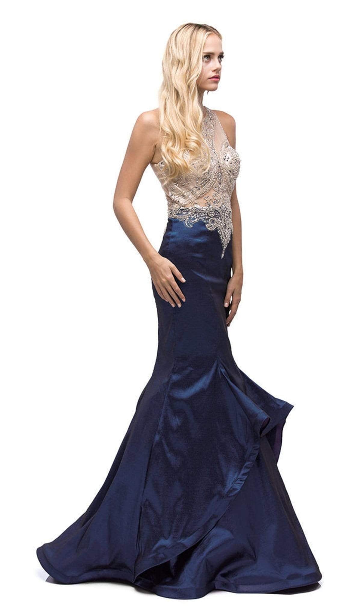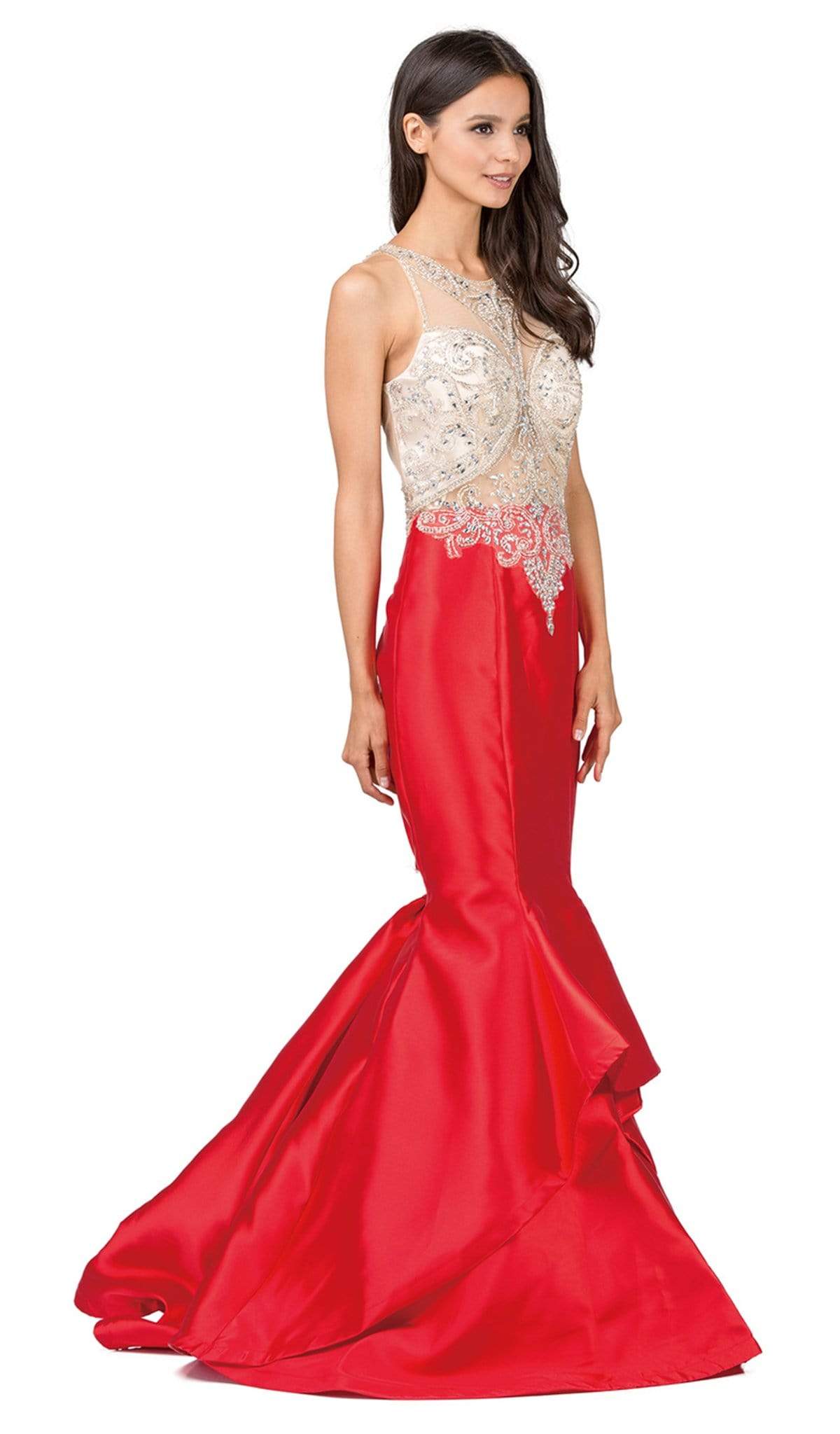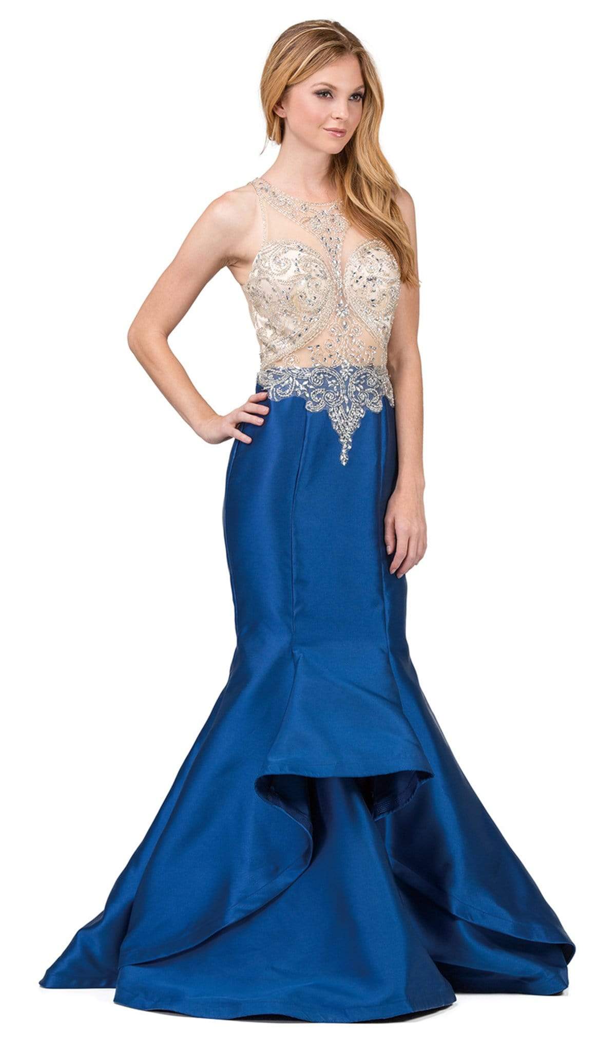 Enamórese de la magnificencia de esta exquisita creación Dancing Queen 9930. Adornado con un elaborado trabajo de pedrería en un corpiño transparente, este conjunto muestra un escote ilusión joya y una espalda transparente. Salpicada de joyas a lo largo de una superposición basque-like, la falda de sirena esculpe antes de acampanar en un dobladillo bajo alto con volantes y una cola. Conviértete en la delicia de todos con esta fascinante obra maestra de Dancing Queen.