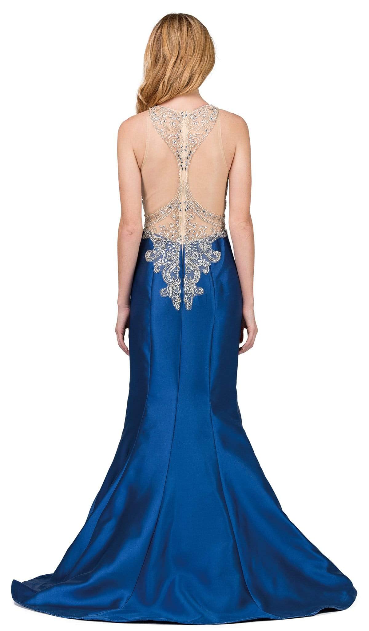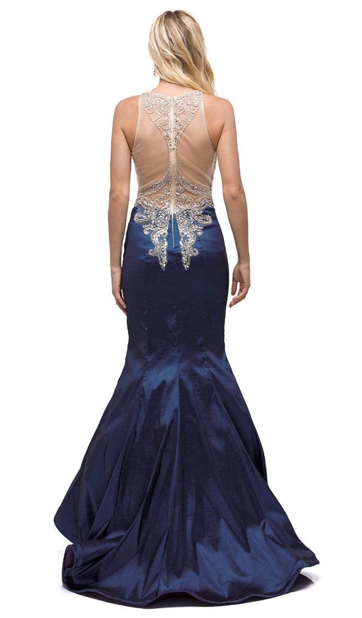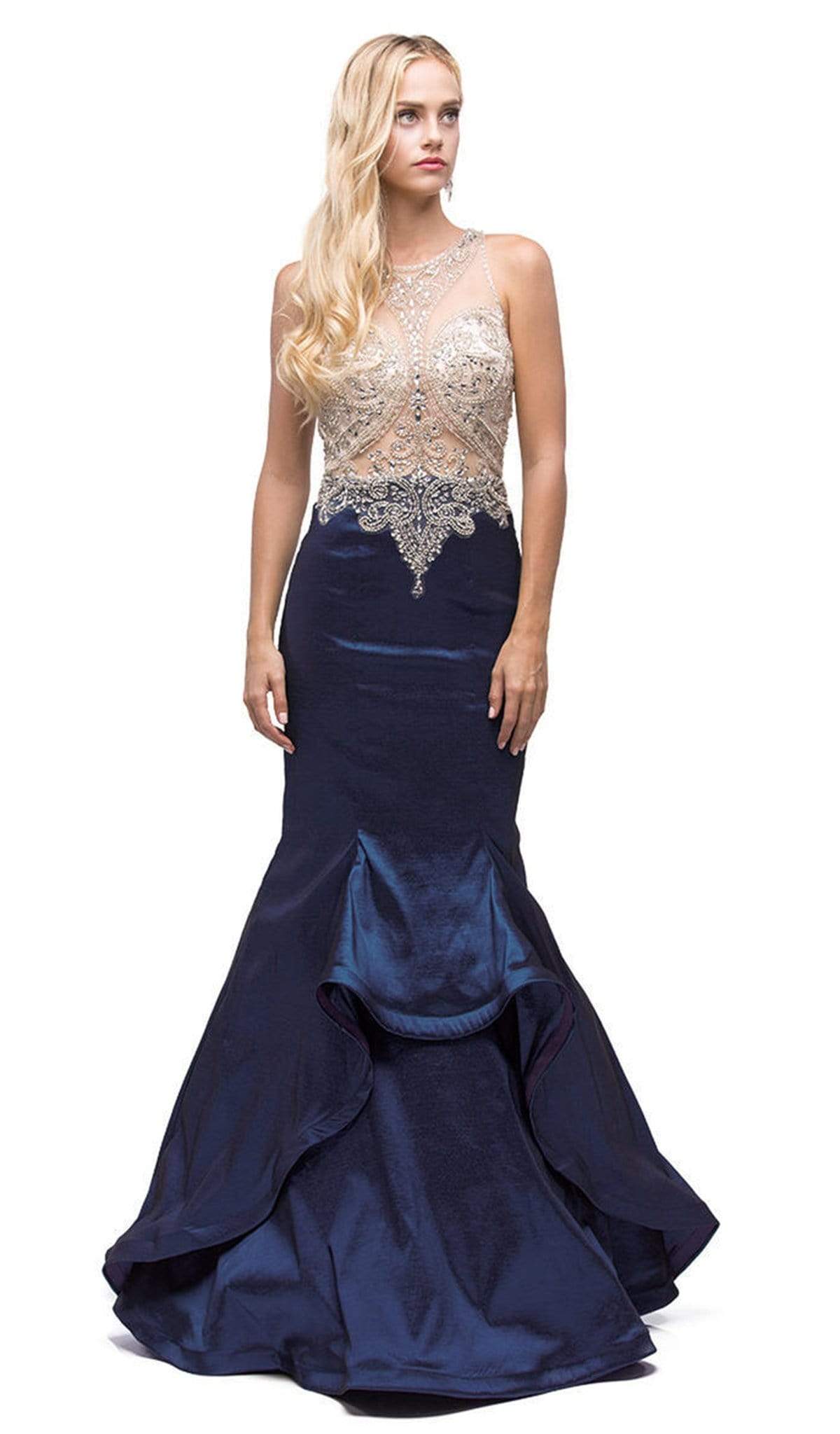 Enamórese de la magnificencia de esta exquisita creación Dancing Queen 9930. Adornado con un elaborado trabajo de pedrería en un corpiño transparente, este conjunto muestra un escote ilusión joya y una espalda transparente. Salpicada de joyas a lo largo de una superposición basque-like, la falda de sirena esculpe antes de acampanar en un dobladillo bajo alto con volantes y una cola. Conviértete en la delicia de todos con esta fascinante obra maestra de Dancing Queen.