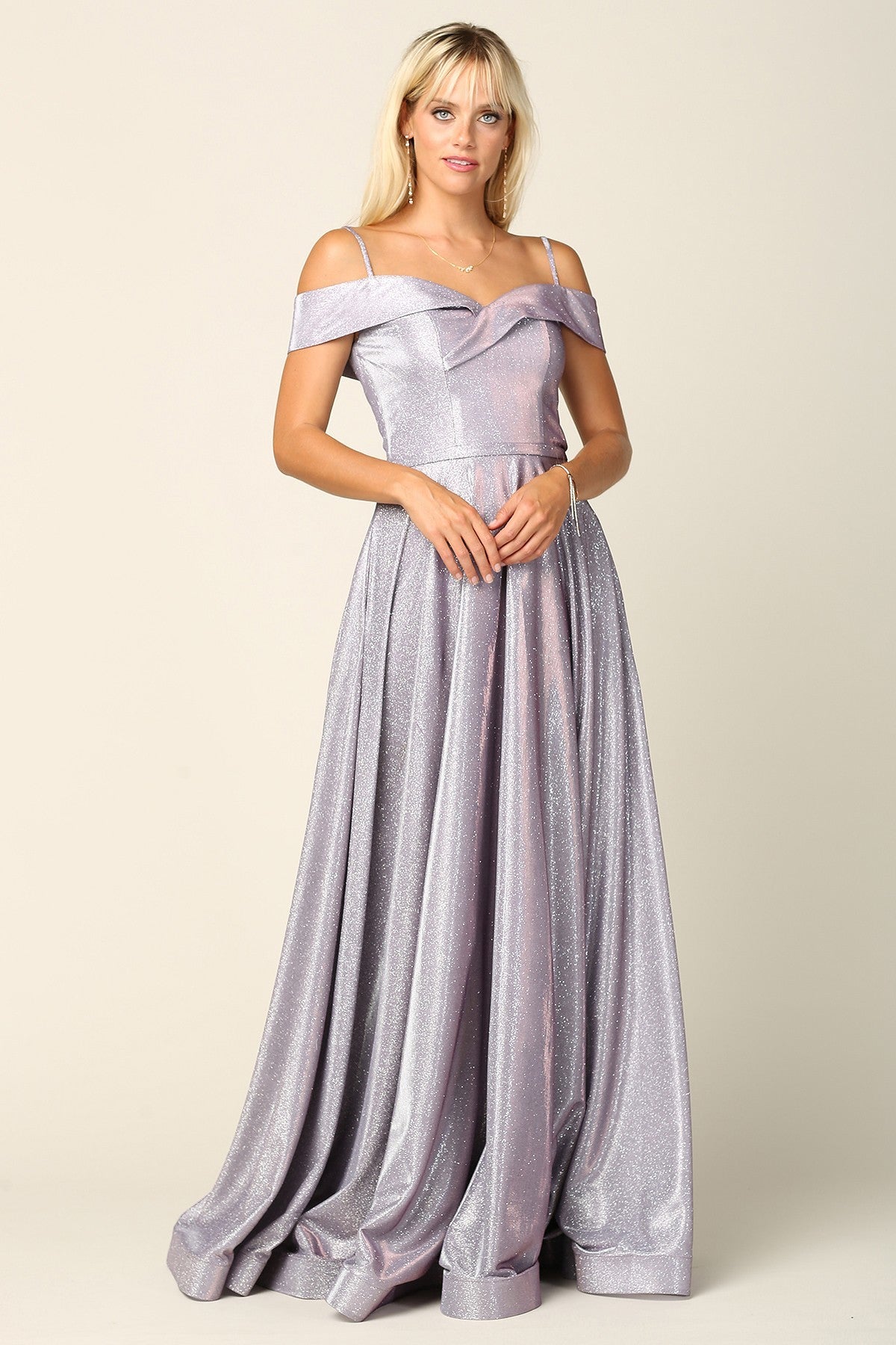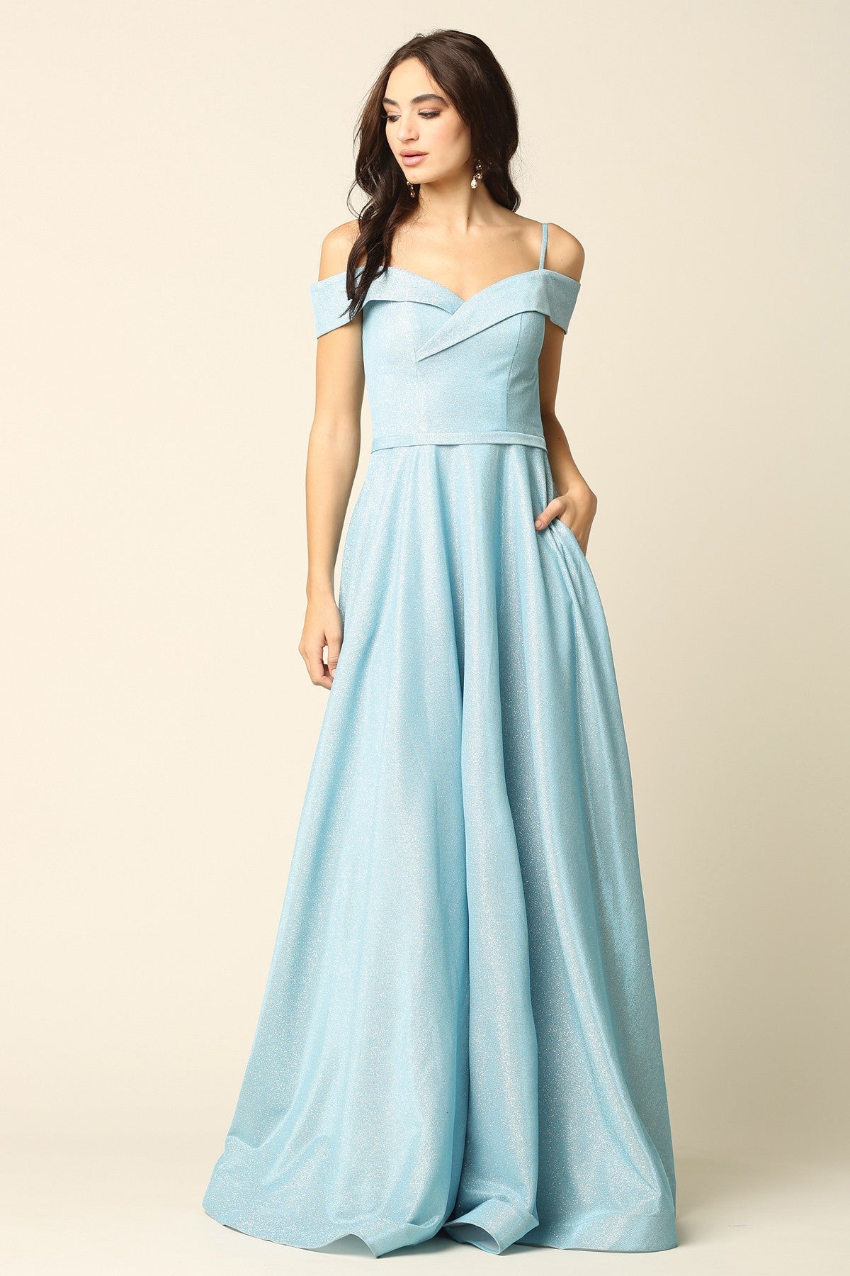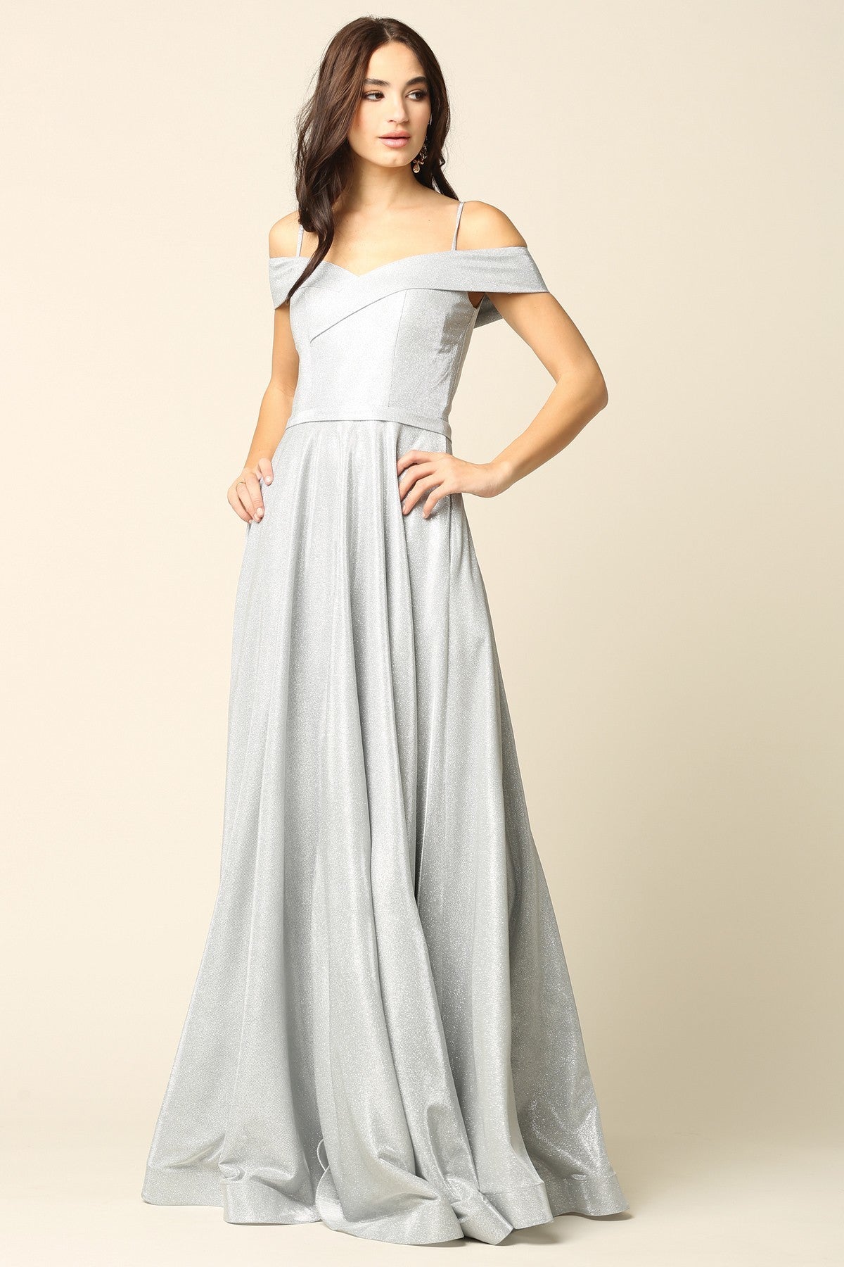 Vestido de fiesta moderno con hombros descubiertos en tejido metalizado. Totalmente forrado con copas y cremallera en la espalda. Con bolsillos.