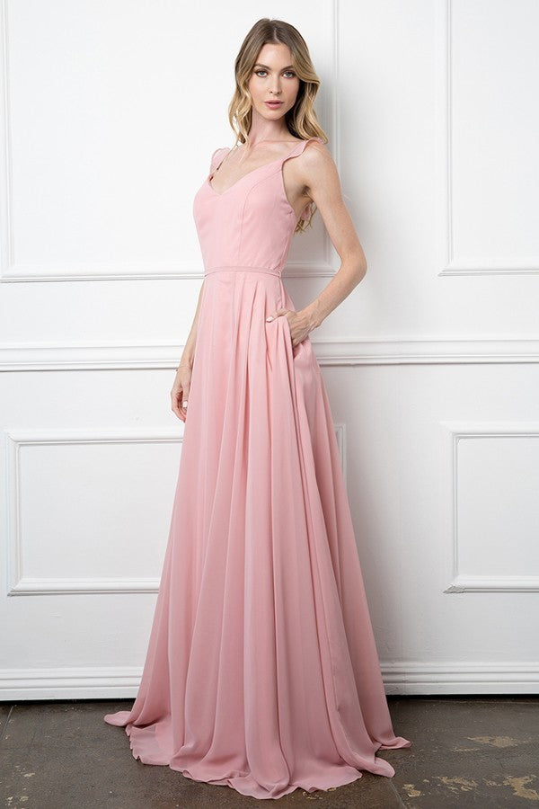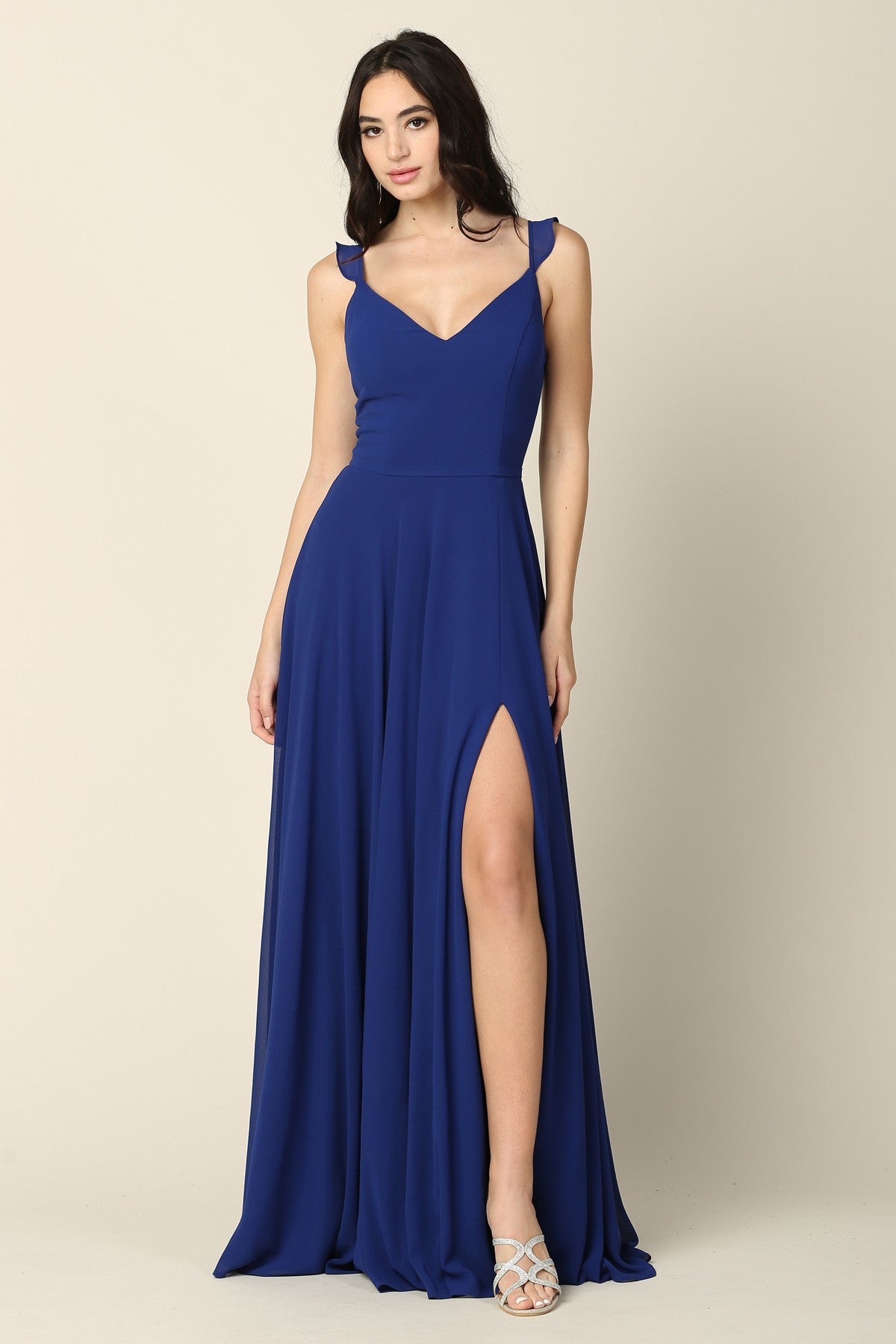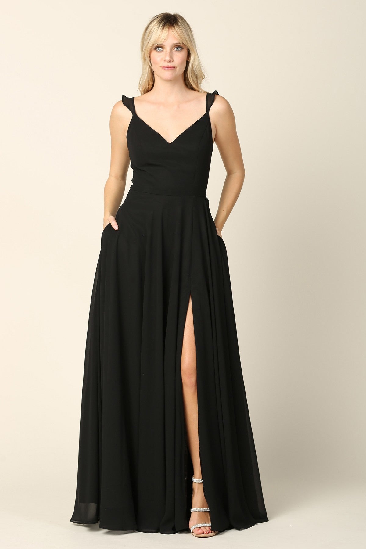 Vestido de gasa lisa, línea A, largo hasta el suelo, con tirantes de volantes. Abertura delantera. Cremallera en la espalda. Forro de satén. Bolsillos.
