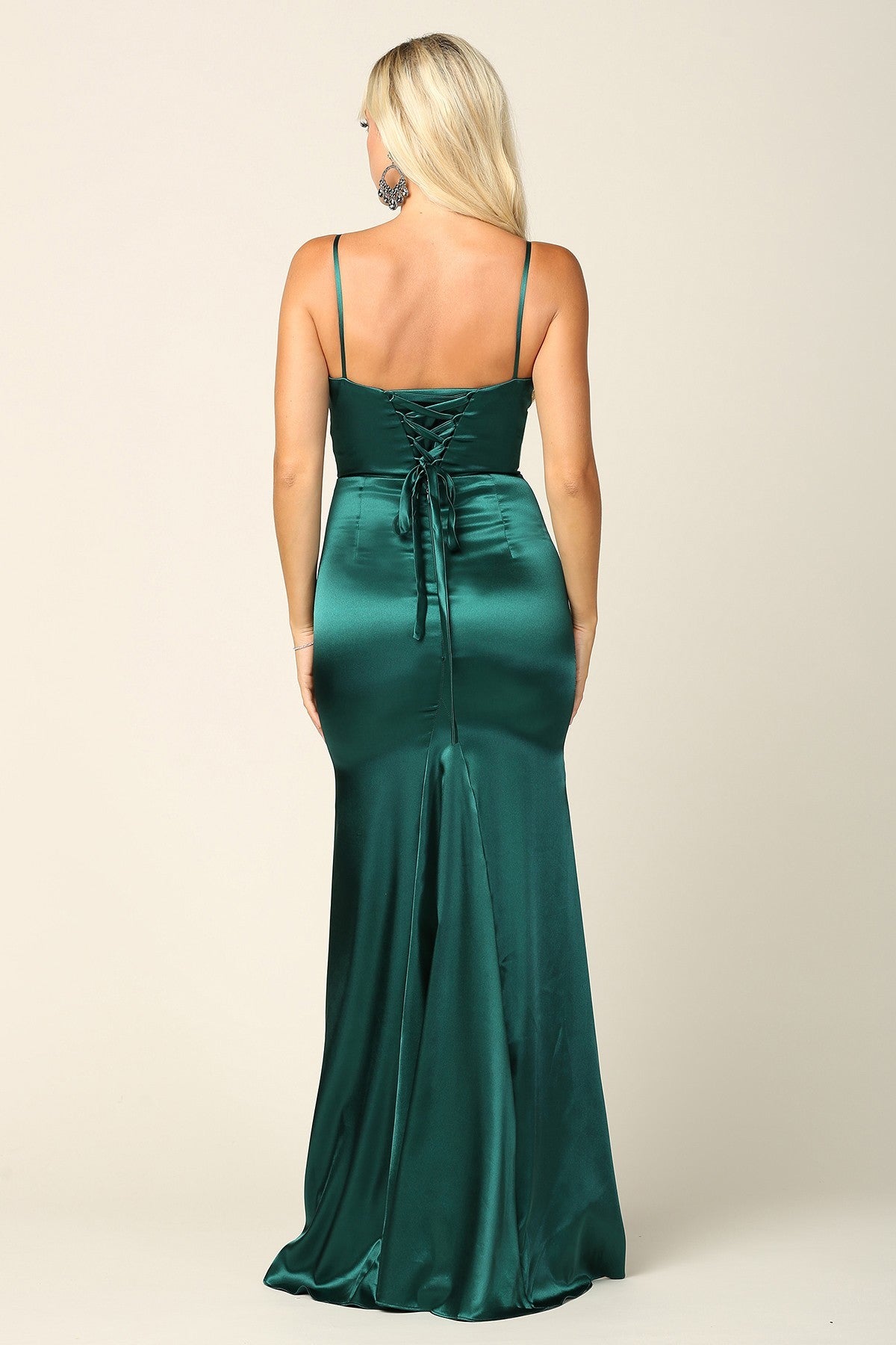 Vestido de fiesta de charmeuse sedosa con tirantes finos y cola larga. Espalda con corsé. Forro completo con copas.