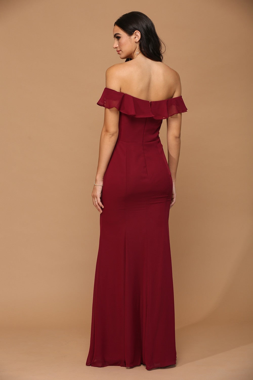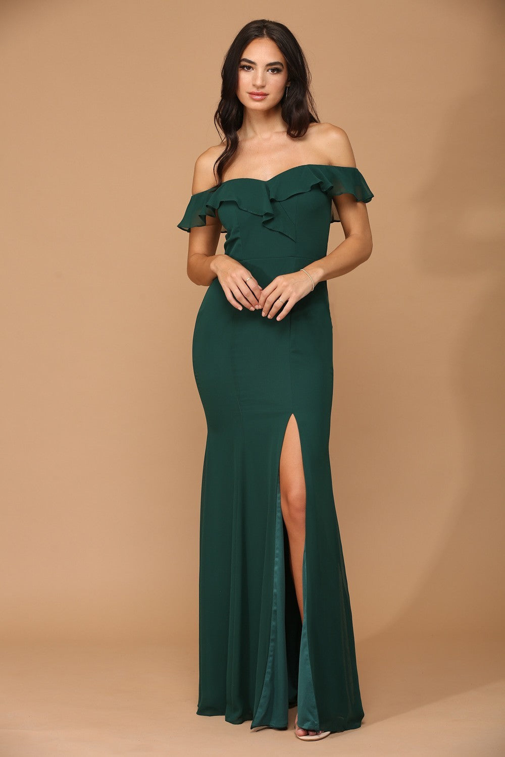 Vestido de gasa con detalle de volantes en los hombros y abertura delantera. Totalmente forrado y con cremallera en la espalda. Sujetador con inserciones.