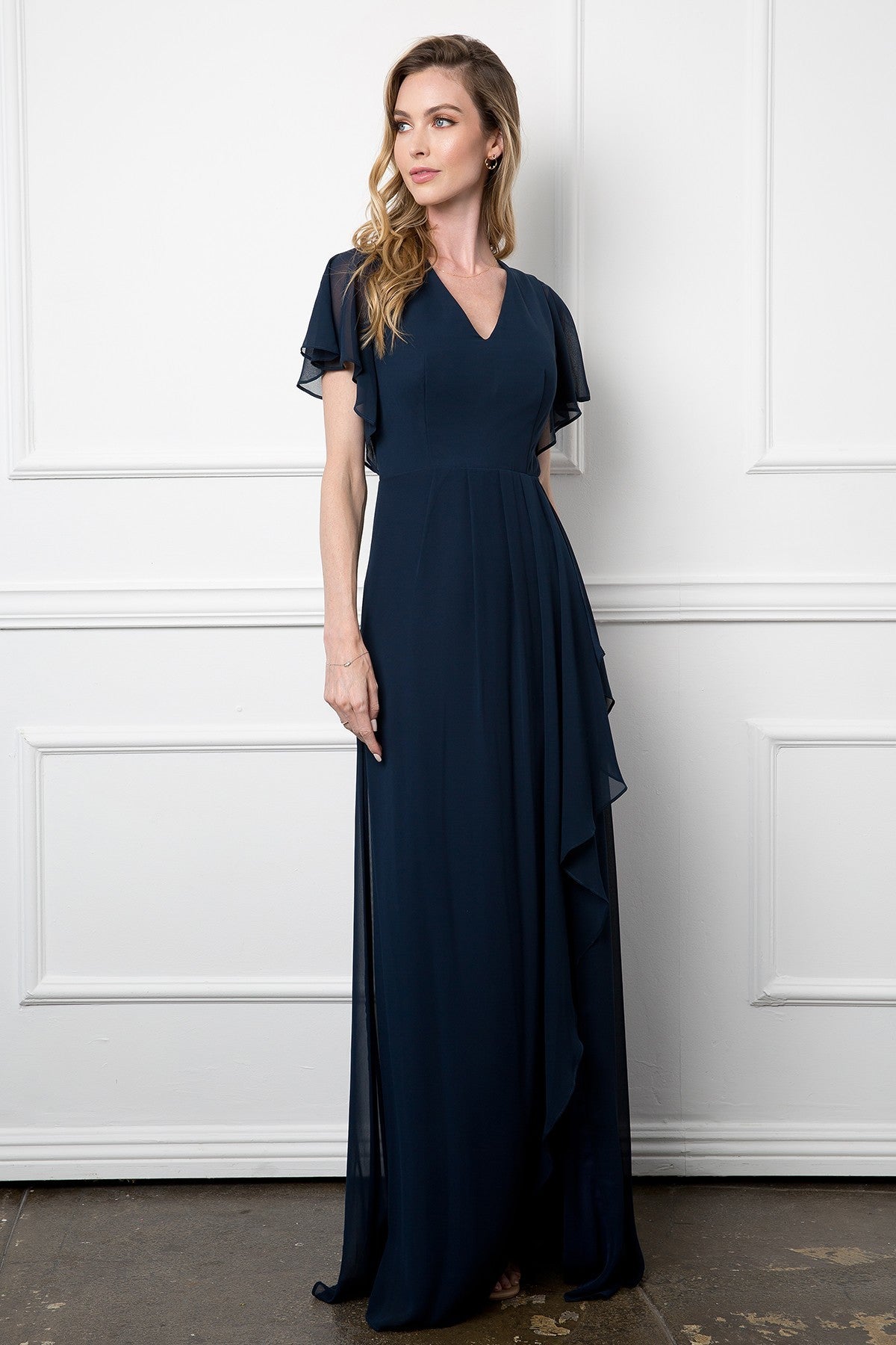 Vestido largo de gasa lisa con escote en pico, mangas, detalle de volante y abertura. Totalmente forrado con copas de sujetador. Cremallera en la espalda. Bolsillos.