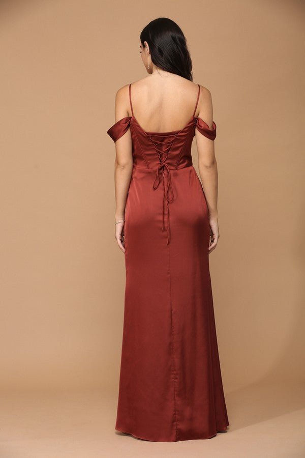 Vestido de gasa satinada sin hombros con corpiño encorsetado y abertura frontal EVA 3461