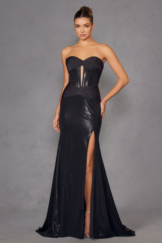 Eleva tu atuendo de noche con este vestido largo sin tirantes de metal con una falda entallada con abertura de Juliet JT2578H. Este hermoso vestido es una mezcla perfecta de elegancia y sofisticación. Presenta un escote corazón sin tirantes que enmarca con gracia. El corpiño es entallado e incluye un top retorcido con un recorte en la parte delantera, lo que añade un elemento de diseño atrevido y moderno. El diseño cruzado en la parte superior del vestido y la cintura realza su silueta estructurada y favorecedora. El vestido se transforma suavemente en una falda que se ensancha en la parte inferior, creando un efecto dramático y elegante. Confeccionado con un lujoso tejido metalizado, el vestido tiene un brillo lustroso que atrapa la luz maravillosamente. Una de las características más destacadas es el detalle de fruncido en la espalda, que añade textura y enfatiza los contornos del diseño. El material es metálico y brillante, lo que se suma a su aspecto lujoso y llamativo. Perfecto para eventos formales, este vestido combina elementos de diseño clásico con toques modernos, lo que garantiza una entrada memorable.