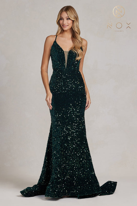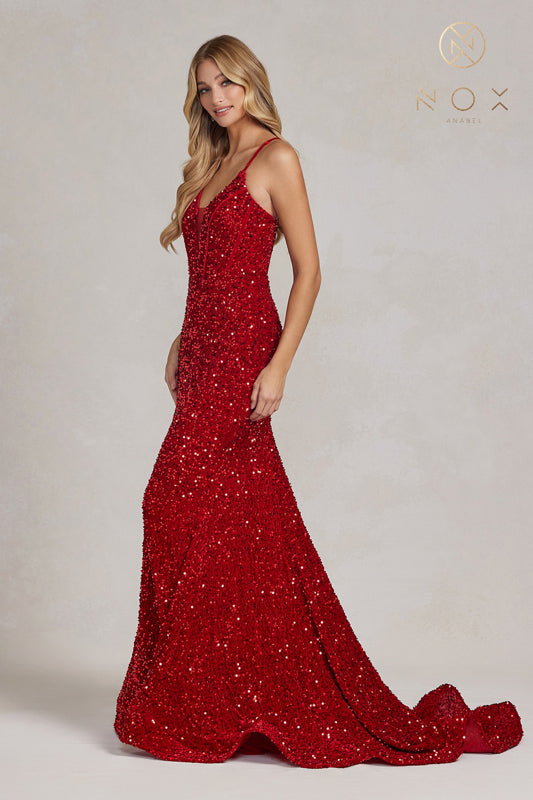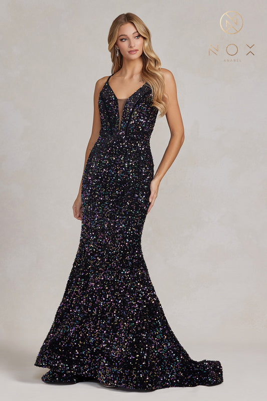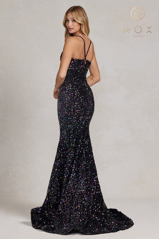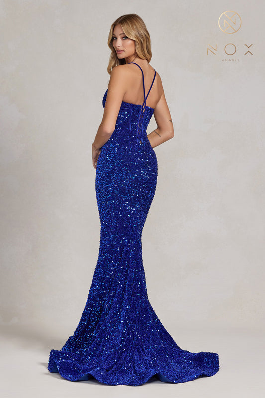 Vestido de sirena con espalda de encaje y lentejuelas de Nox Anabel C1109