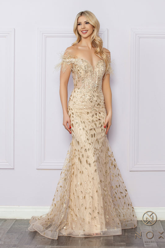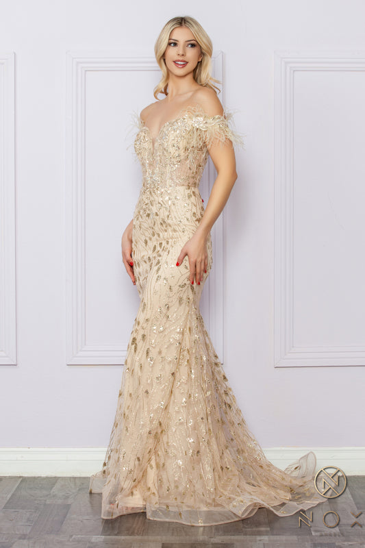 Prepárate para acaparar todas las miradas con este vestido largo de plumas con apliques de purpurina bordada y falda sirena ajustada de Nox Anabel L1255.