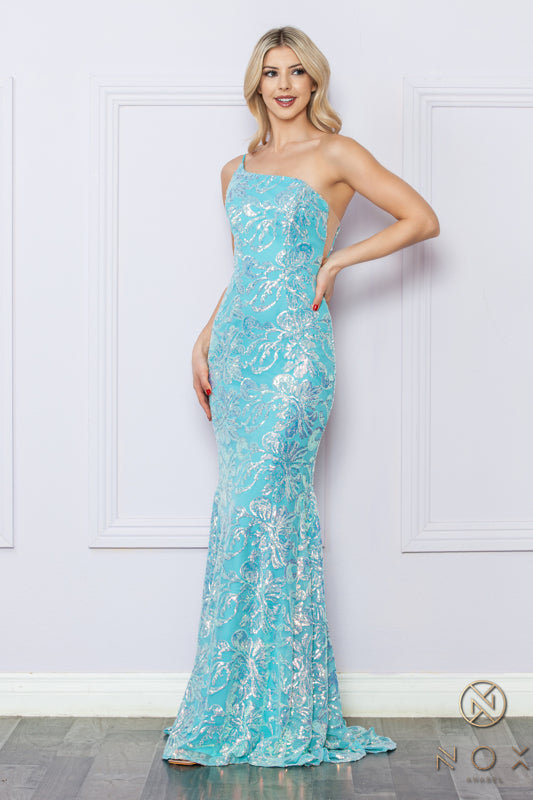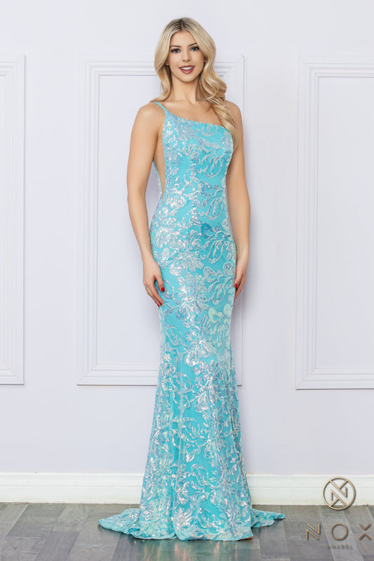 Te encantará dar vueltas con este vestido largo de un hombro con estampado floral de lentejuelas y falda sirena ajustada de Nox Anabel R1308.