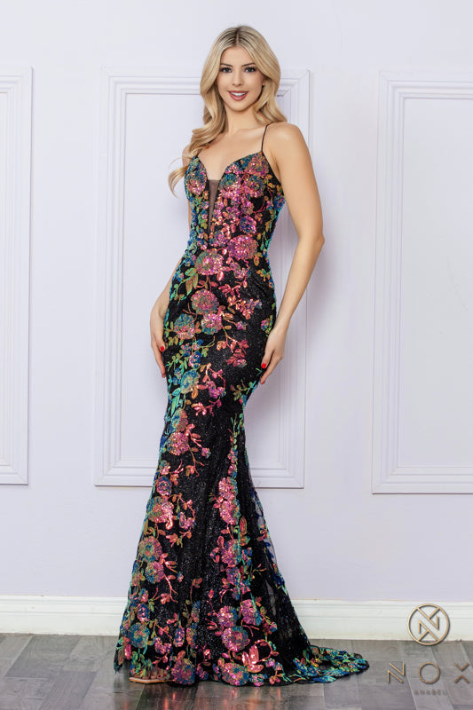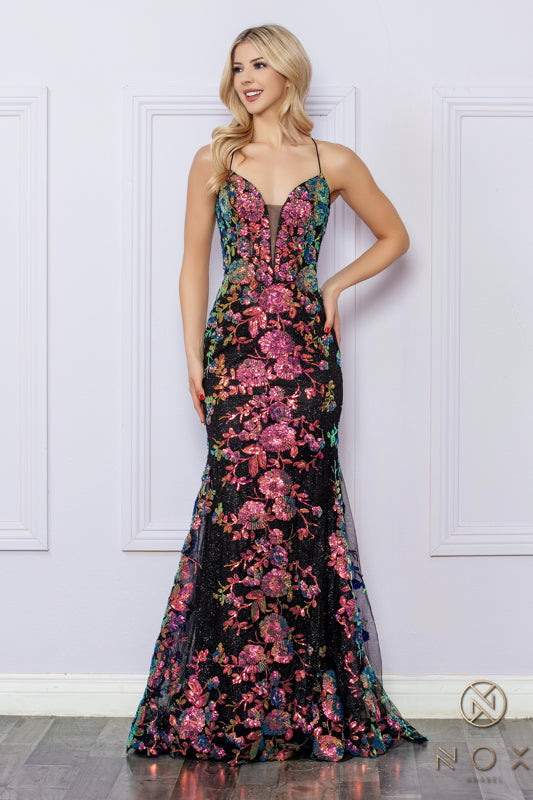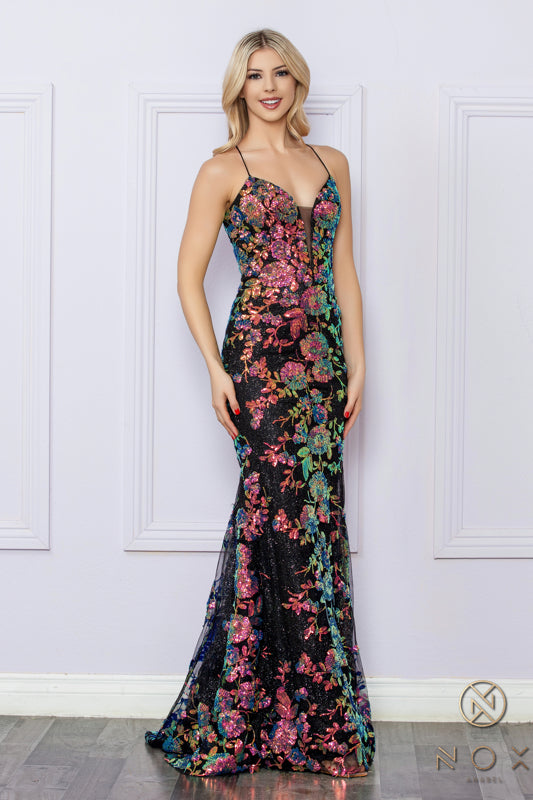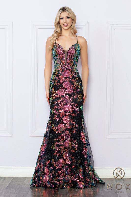 Luce radiante con este vestido largo sin mangas con apliques florales de lentejuelas bordadas y falda sirena ajustada de Nox Anabel R1439.