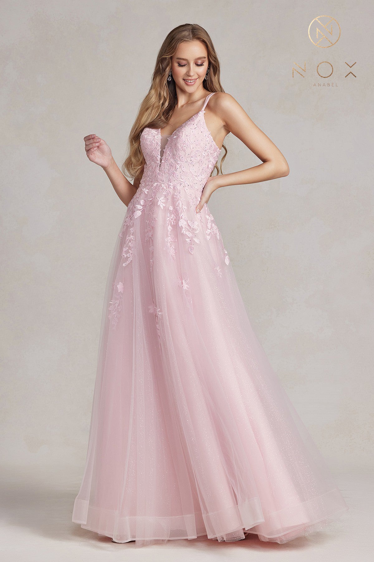 Hazte un selfie con este vestido largo sin mangas con apliques de encaje y espalda con cordones y falda de tul brillante de línea A de Nox Anabel T1136.