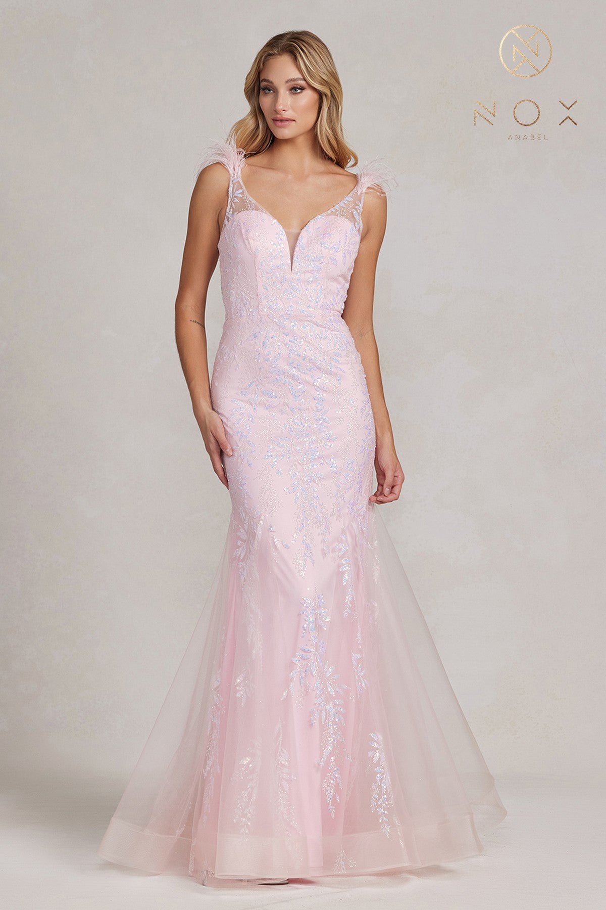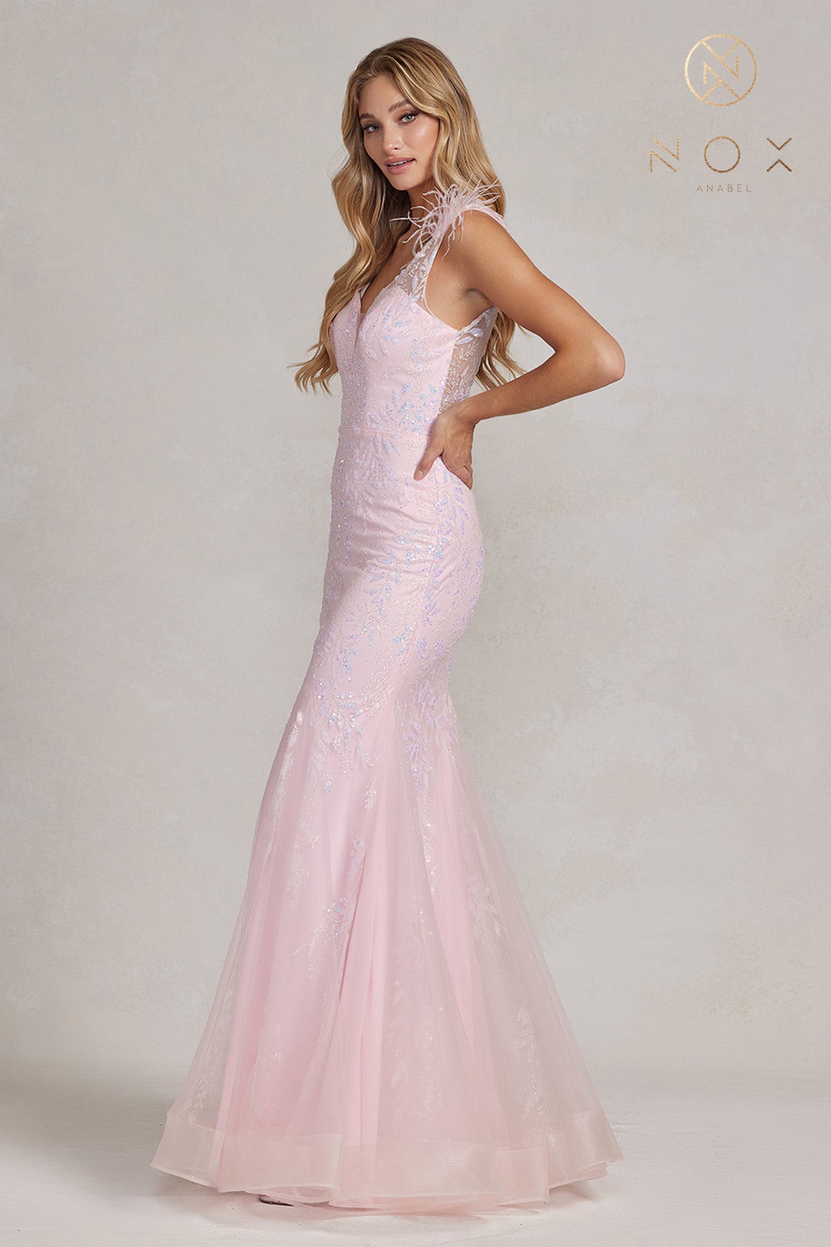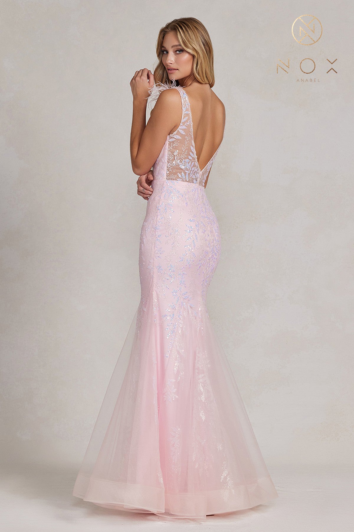 Vestido de sirena de plumas adornadas de Nox Anabel T1208