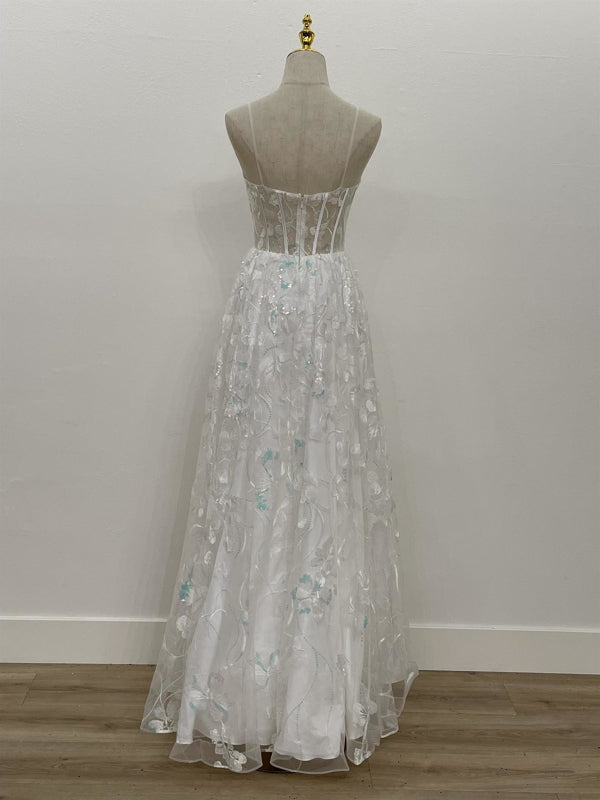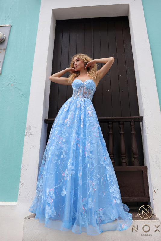 Luce a la moda con este vestido corsé largo de lentejuelas bordadas y apliques florales con falda de línea A de Nox Anabel T1332. Los tirantes desmontables están incluidos - ¡dándote un look versátil sin tirantes!