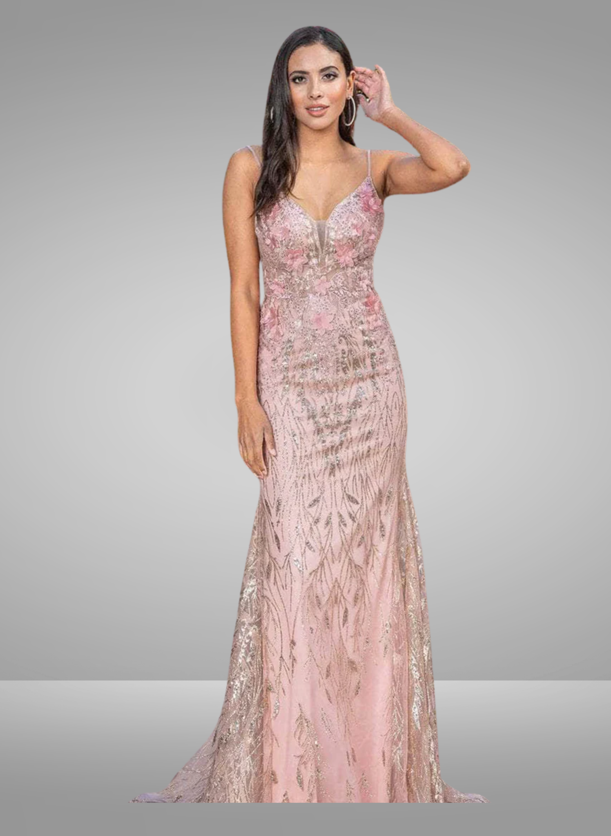 Conviértete en una vampiresa con este seductor vestido de Dancing Queen 4275. Esta belleza cuenta con un corpiño sin mangas con escote en V adornado con bordados florales y sostenido por tirantes finos que conducen magníficamente a una espalda en V profunda. Una divina falda de sirena acentuada con adornos de enredadera adornados con brillantes lentejuelas fluye hacia abajo con gracia para terminar con un dobladillo de cuerpo entero y una sutil cola. Este glamuroso Dancing Queen te da un look intrincado que durará toda la vida. Las modelos llevan los colores Oro, Verde Cazador, Oro Rosa y Plata.
