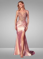 Este vestido entallado cuenta con un profundo escote en V y tirantes finos, con un cuerpo adornado que brilla con intrincados adornos de perlas. Confeccionado en satén elástico con purpurina, ofrece un ajuste que realza la figura con una línea de cadera fruncida y una sensual abertura en la pierna para un mayor atractivo. Perfecto para ocasiones formales, bailes de graduación o eventos de etiqueta, este vestido combina sin esfuerzo elegancia y glamour.