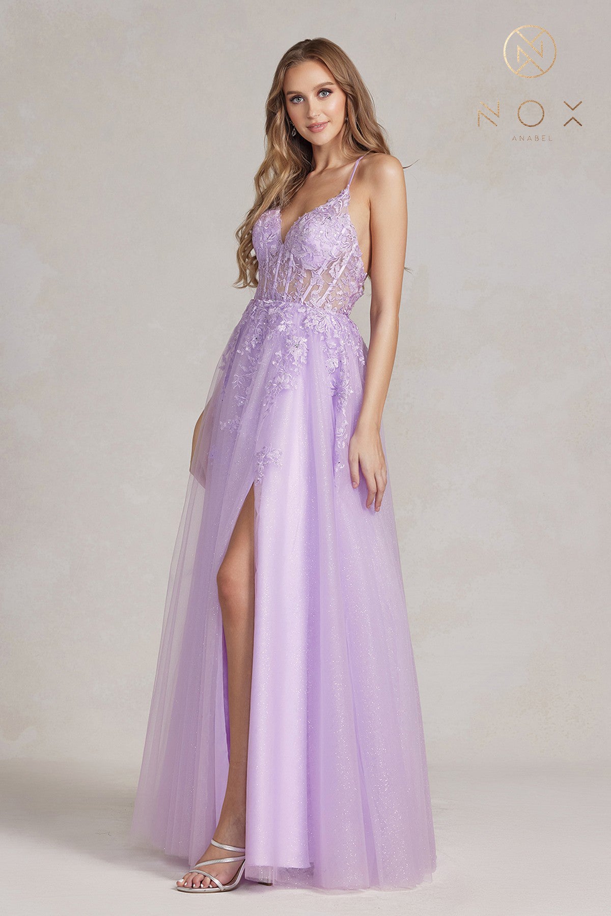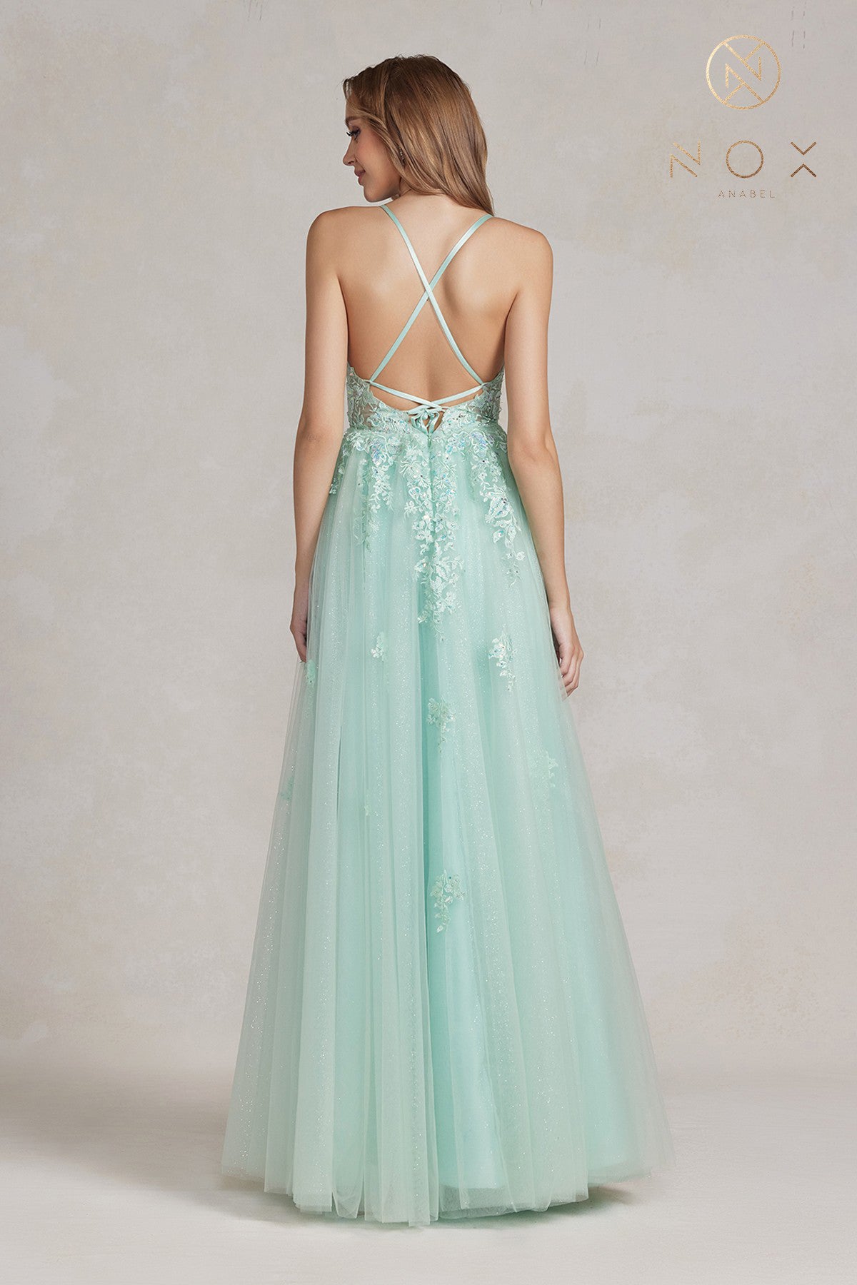 Vestido largo con cuerpo de tul bordado de Nox Anabel R357