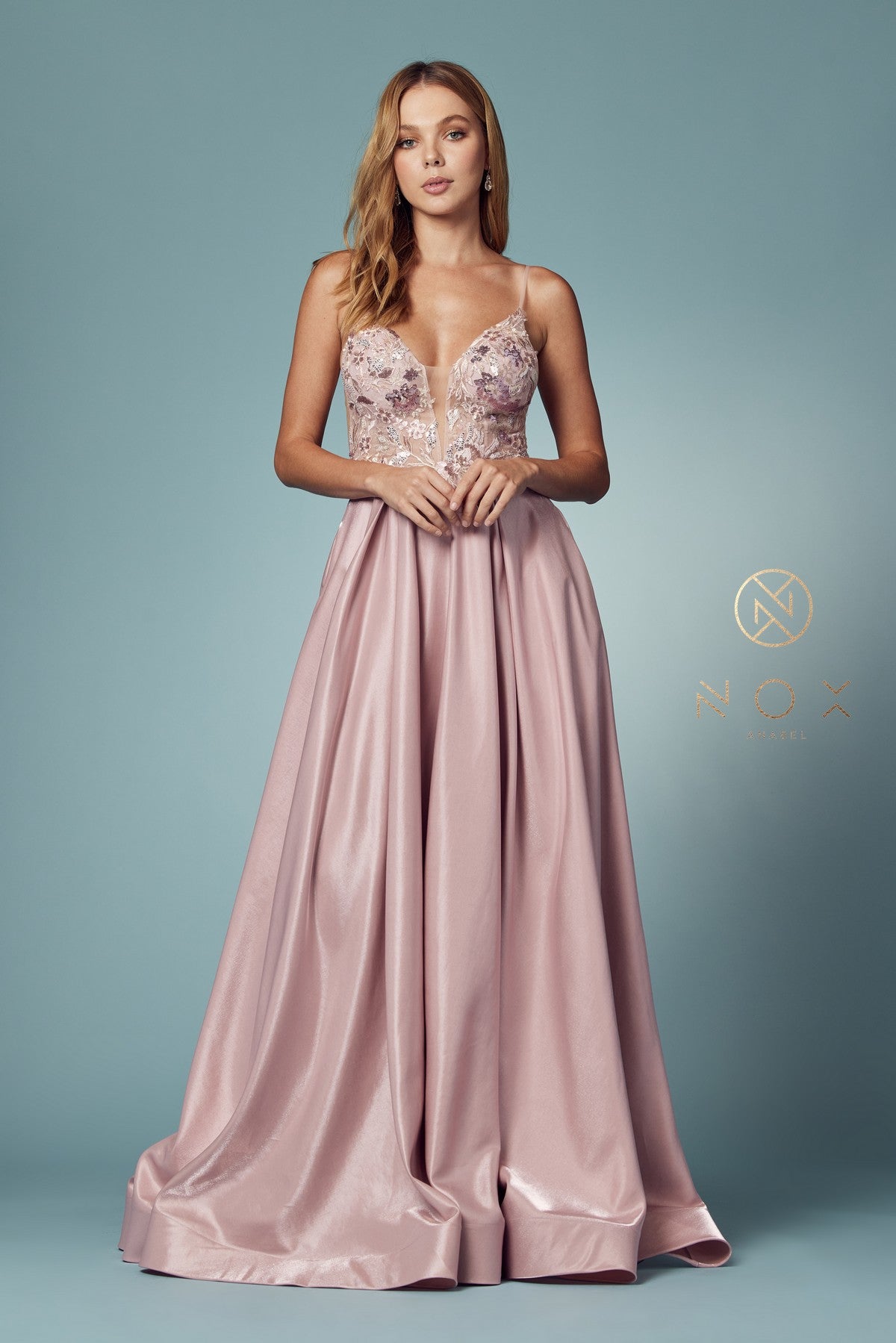 Vestido Largo con Apliques Florales y Espalda Corsé de Nox Anabel C415