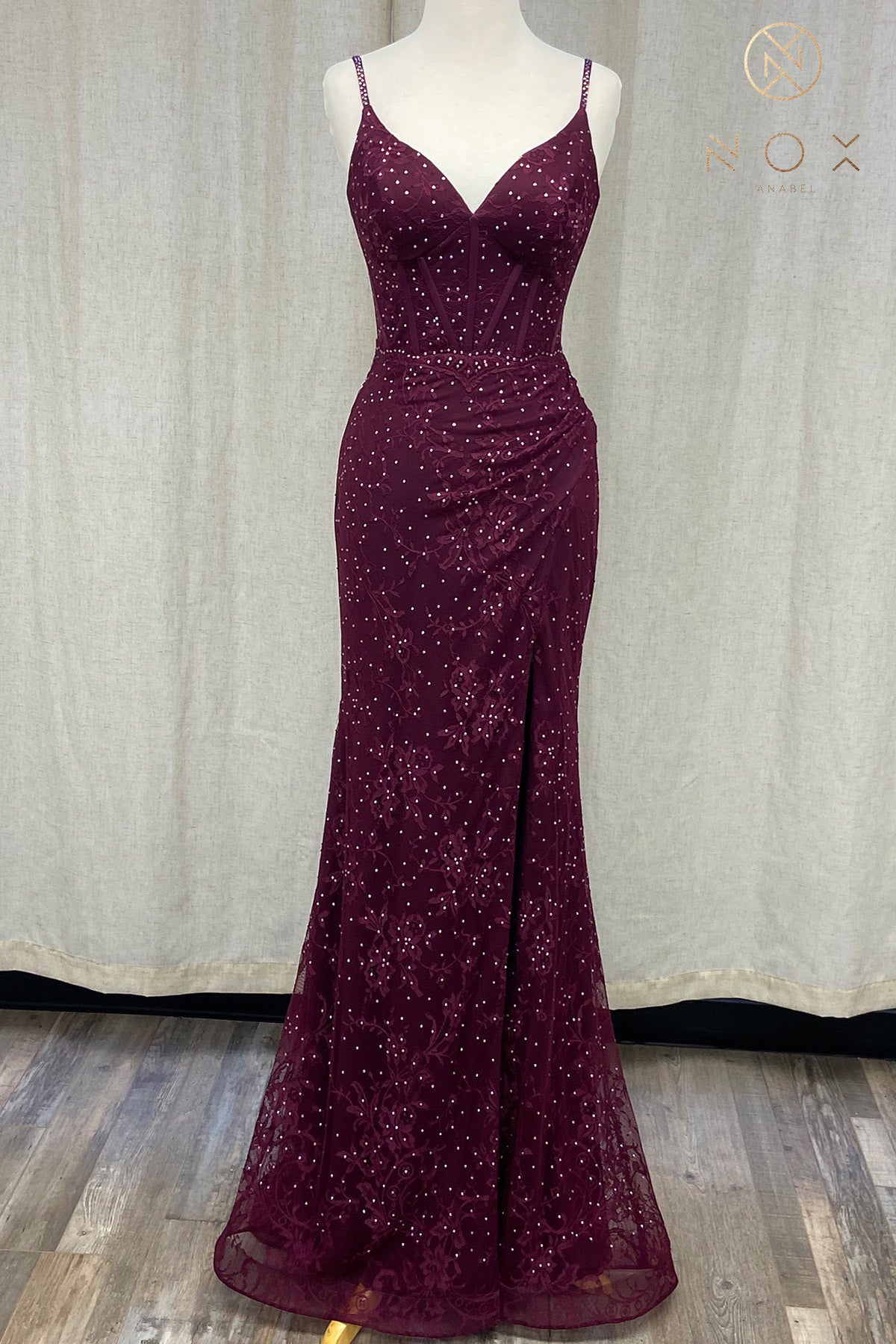 Vestido de sirena con pedrería florales y cuello en V de Nox Anabel C1117