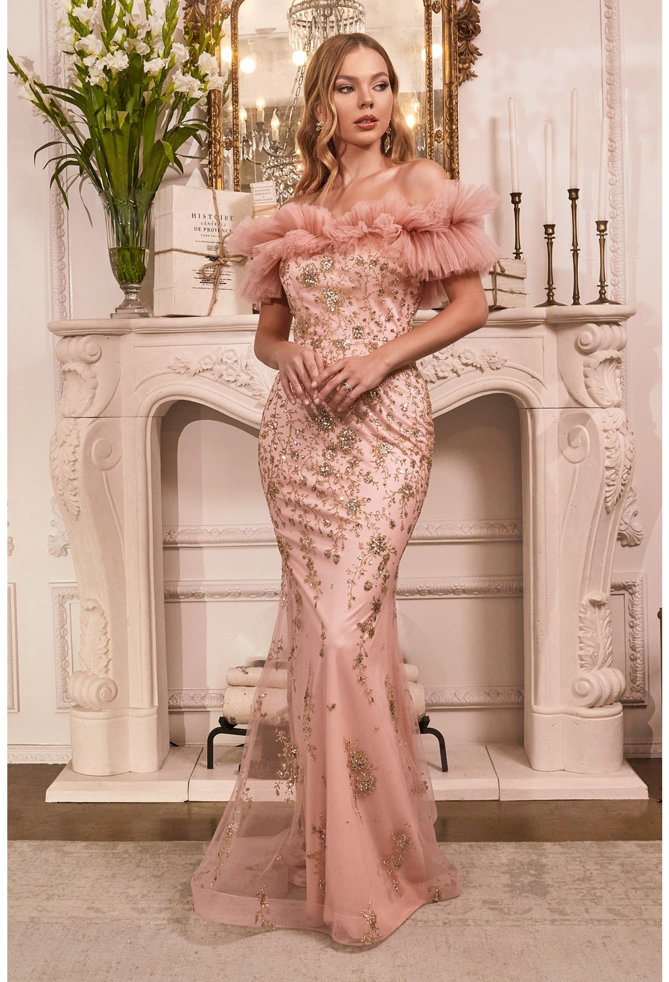 Vestido de encaje fuera del hombro con detalle de cola J836 de Ladivine